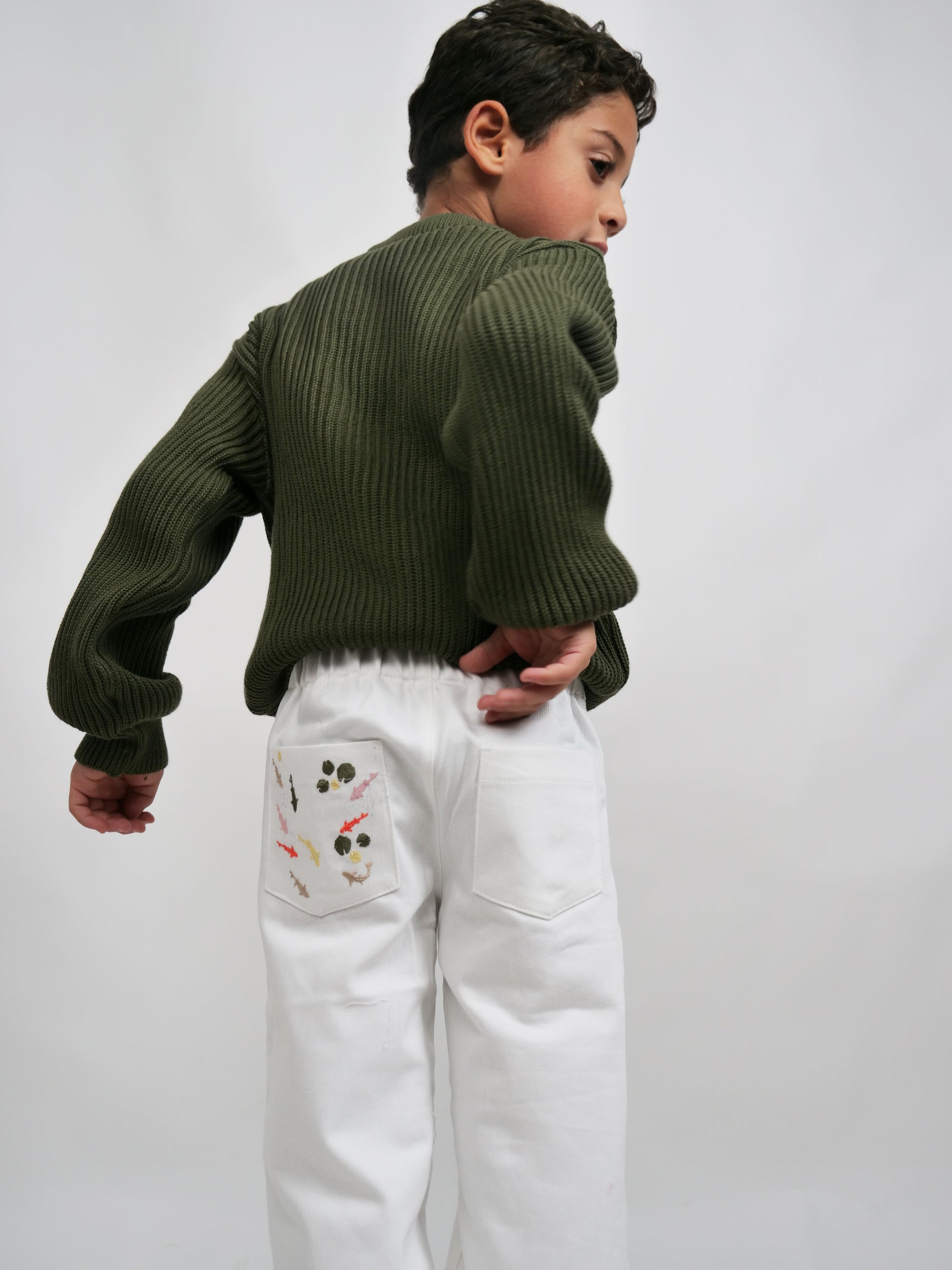 Tailored from 100% cotton gabardine, these wide-leg trousers offer structure with an easy flow. Featuring a comfortable elastic waist and delicate embroidery on the back pocket, they combine natural warmth with subtle playfulness — a perfect balance of style and comfort.